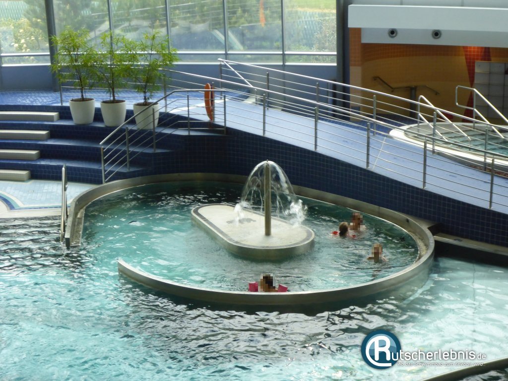 Der Schwimmerbereich ist nahtlos mit dem Spaßbecken verbunden. Für körperlich eingeschränkte Personen gibt es einen behindertengerechten Einstieg über lange Rampe mit einem Handlauf zum festhalten. Alternativ geht es über die breite Treppe in das beheizte Wasser. Im Becken sorgen eine Schwalldusche und eine effektvolle Wasserfontäne für Abwechslung.