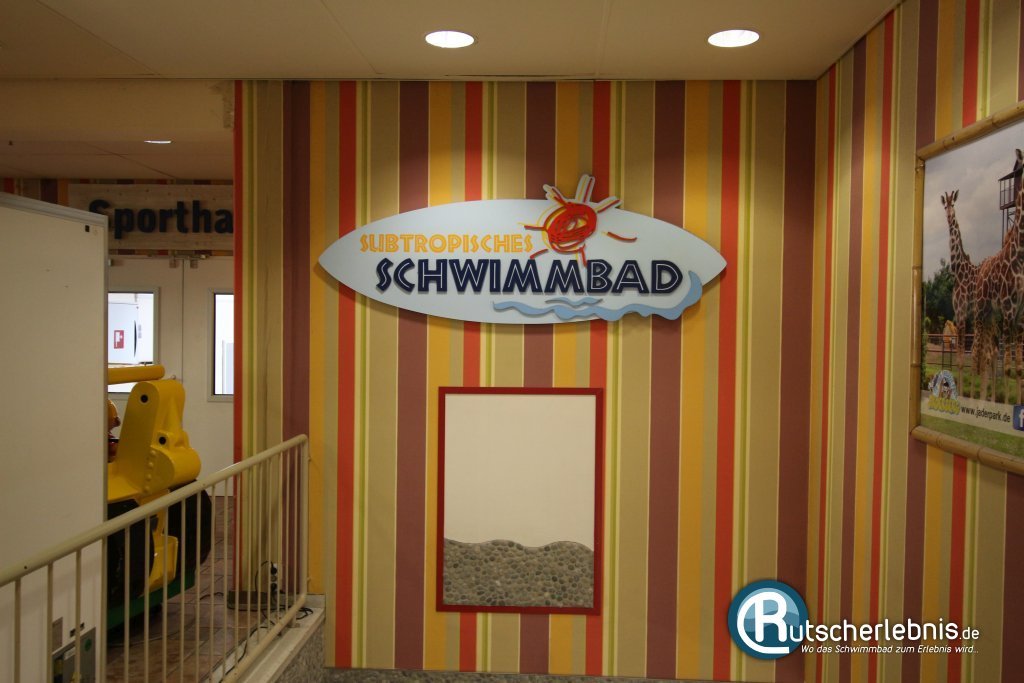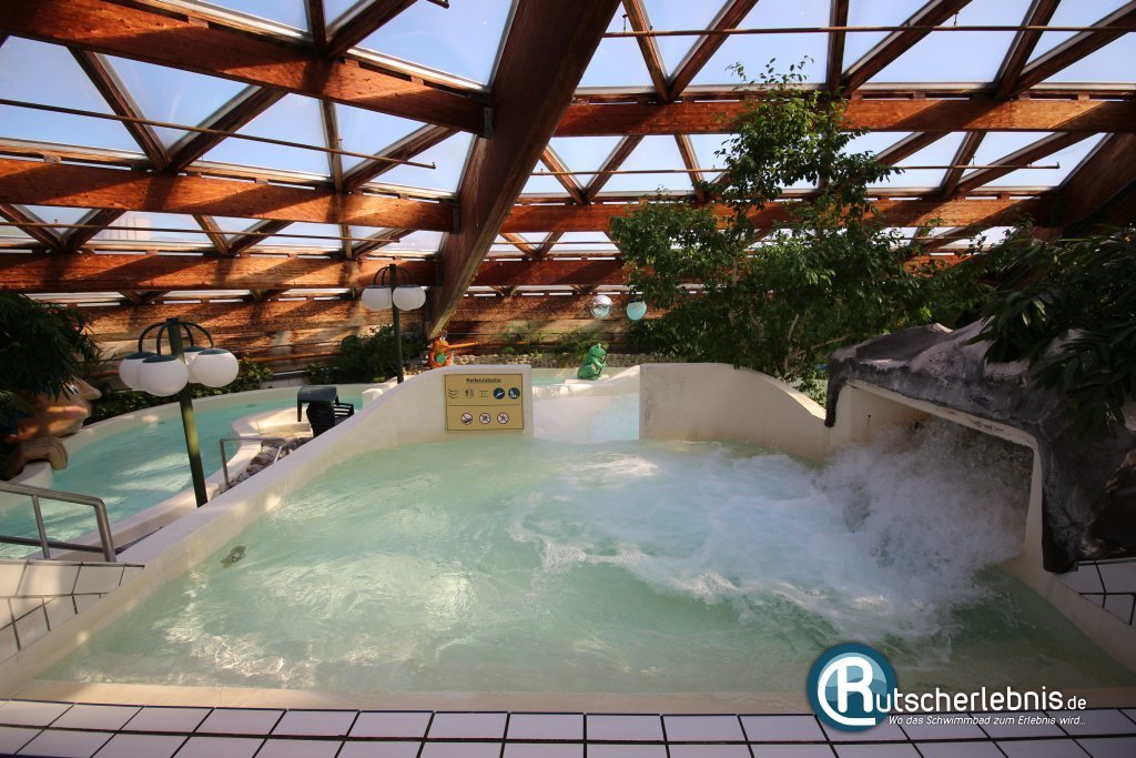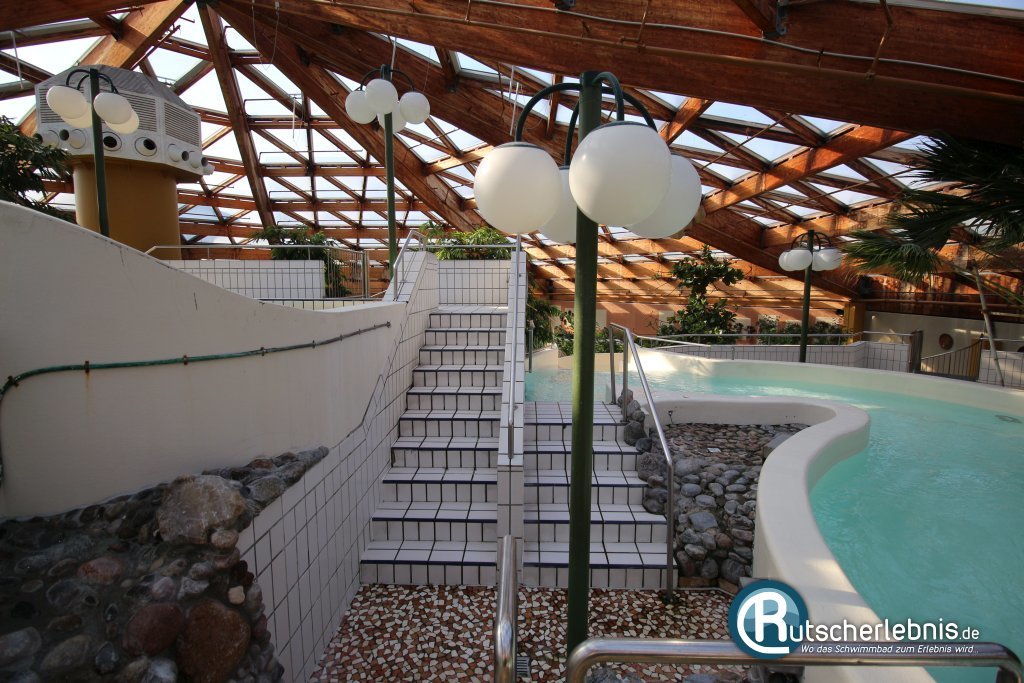 Sobald man das Zwischenbecken über die Treppe verlassen hat kann man über die links daneben befindliche, offene Rutsche hinab in den Keller des Bades düsen. Diese kurze aber knackige Rutsche macht ordentlich Spaß und ist gleichzeitig der schnellste Weg, um ins Wellenbecken zu gelangen. Dort endet die Rutsche im flachen Strandbereich.