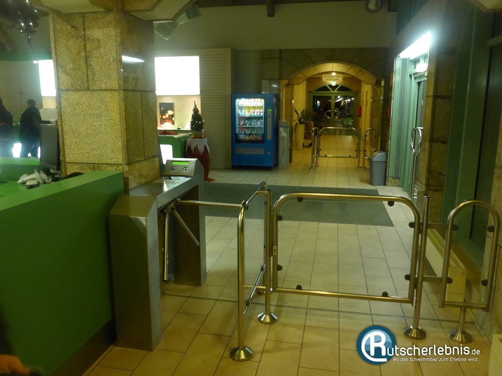 Der Eingangsbereich besticht mit seiner grasgrünen Kassentheke. Hier bekommt man vom freundlichen Personal seine Eintrittskarten. Im Eingangsbereich gibt es außerdem einen recht geräumigen Bademoden und -zubehör-Shop, in welchem man unter anderem Bikinis, Badehosen, Wasserbälle und Badeschuhe kaufen kann. Durch ein Drehkreuz gelangt man nach dem Bezahlen zu den Umkleiden.