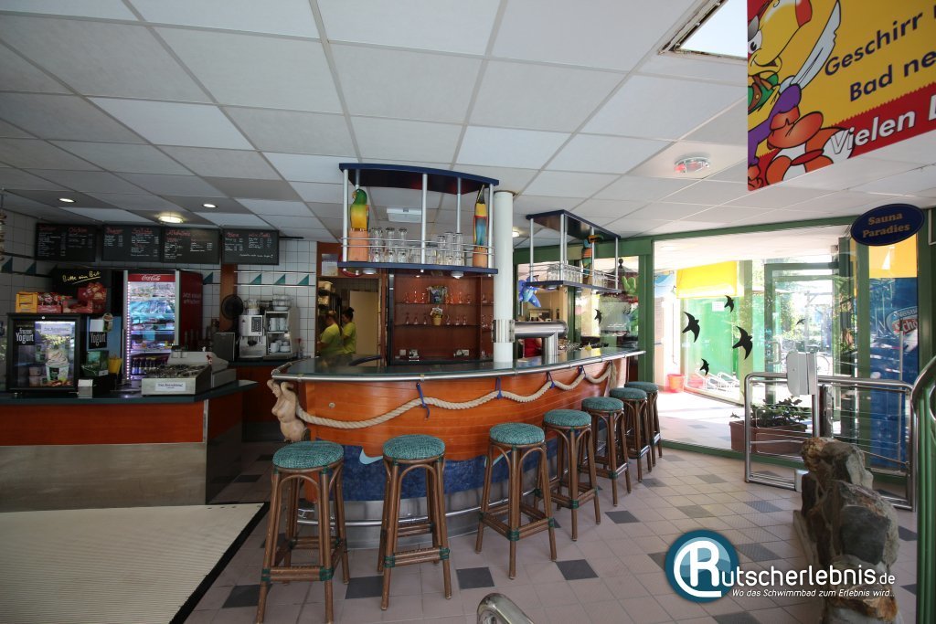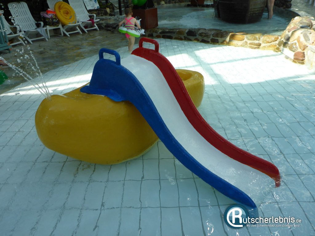 Lustig ist auch die grüne Kinderrutsche, die sich am Rand des Beckens entlang schlängelt und aus knapp zwei Metern Höhe startet. Die offene Riesenrutsche ist eher gemütlich und Kinder können hier erste Rutscherfahrungen sammeln. Eltern können dank der niedrigen Höhe und des Verlaufes direkt am Becken ihren Nachwuchs auch an der Hand nehmen und die Rutschpartie so begleiten.
