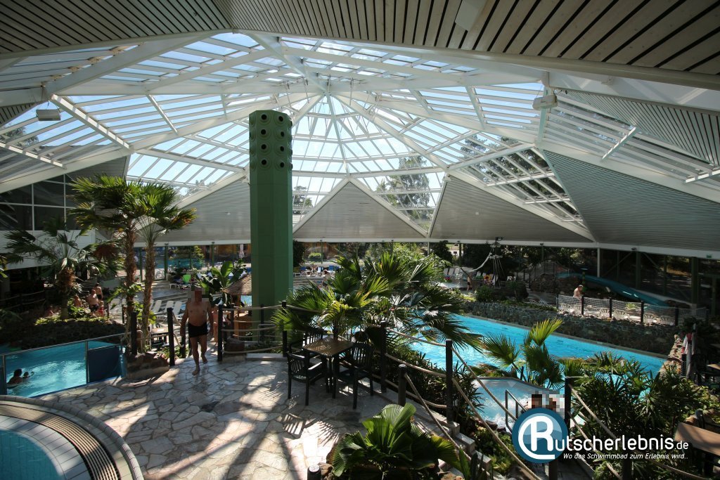 Aus dem Umkleidebereich geht es nun wieder die Treppe hoch zur subtropischen Badelandschaft. Die toll gestaltete Wasser- und Urlaubslandschaft vermittelt dank vieler Grünpflanzen, hoher Palmen und viel Tageslicht Südsee-Feeling. Der Badespaß findet in einer runden Halle mit sternförmigem Glasdach statt. Den meisten Platz nimmt das große Tropen-Erlebnisbecken ein. Das Wellenbecken verfügt über einen flachen Strandeinstieg. Hier brechen die Wellen schön in sich zusammen und machen den Strandurlaub mitten in Niedersachen perfekt. An der Seite ergießt sich ein Wasserfall ins Becken, für spritzige Unterhaltung sorgt außerdem eine Wasserkanone.